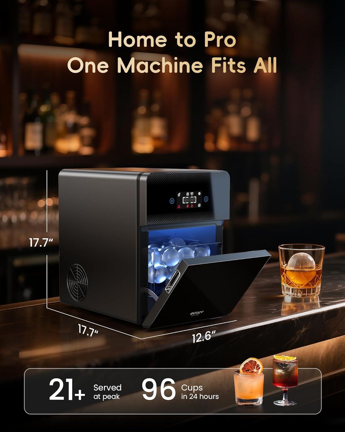 Premium Ice Ball Always Ready: Produces up to 96 large ice spheres per day, storing 45 at once—ideal for bars serving 20–25 guests. Not a refrigerator; short-term storage may melt, so transfer ice to your freezer for over 24h