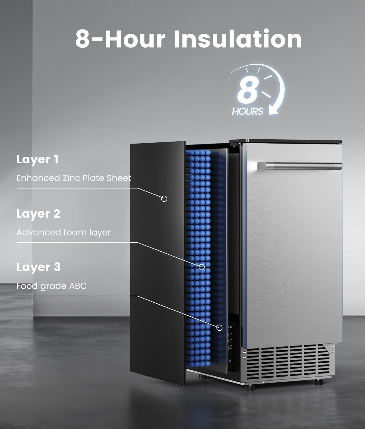 Durable & Sturdy & Insulated – Crafted from high-quality materials, this ice maker is built to last in demanding commercial environments. Advanced insulation keeps ice frozen longer, minimizing waste and ensuring a constant supply for your business