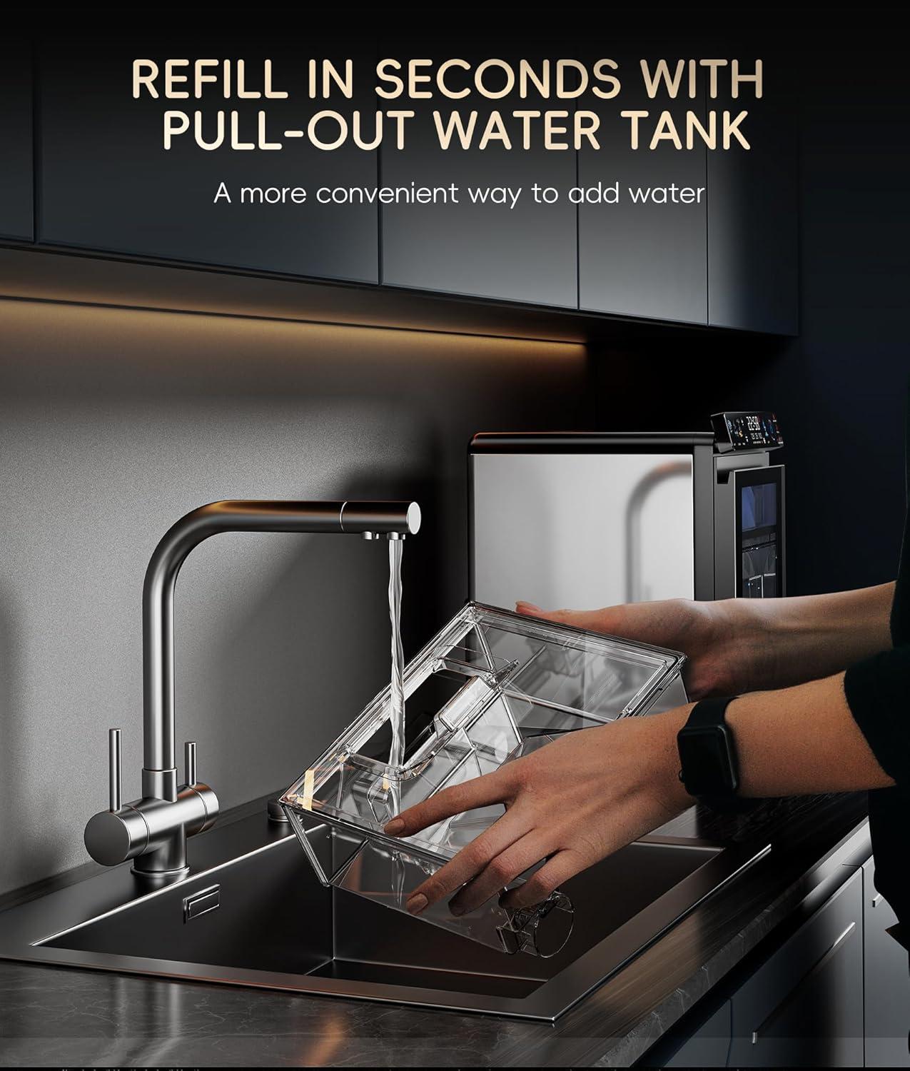 Simplify Water Refills & Ice Access: Pull-out water tank streamlines refills and cleaning. Easily remove the basket to transfer ice without mess or hassle