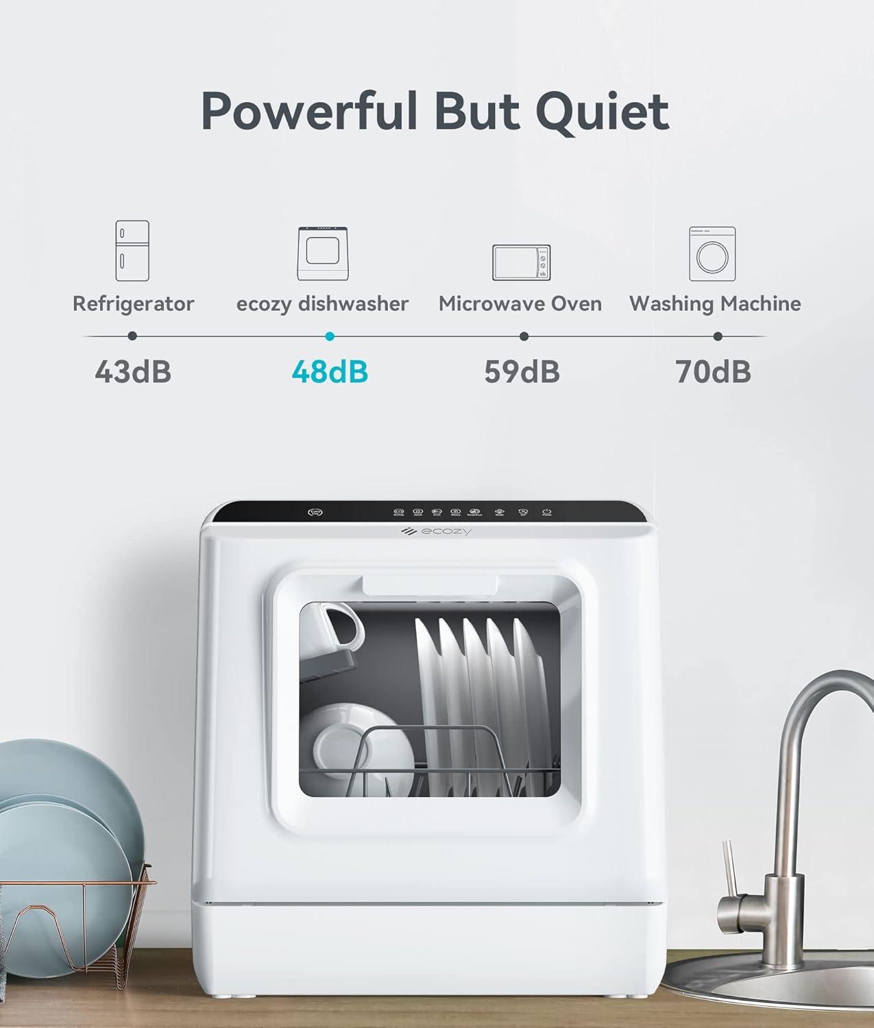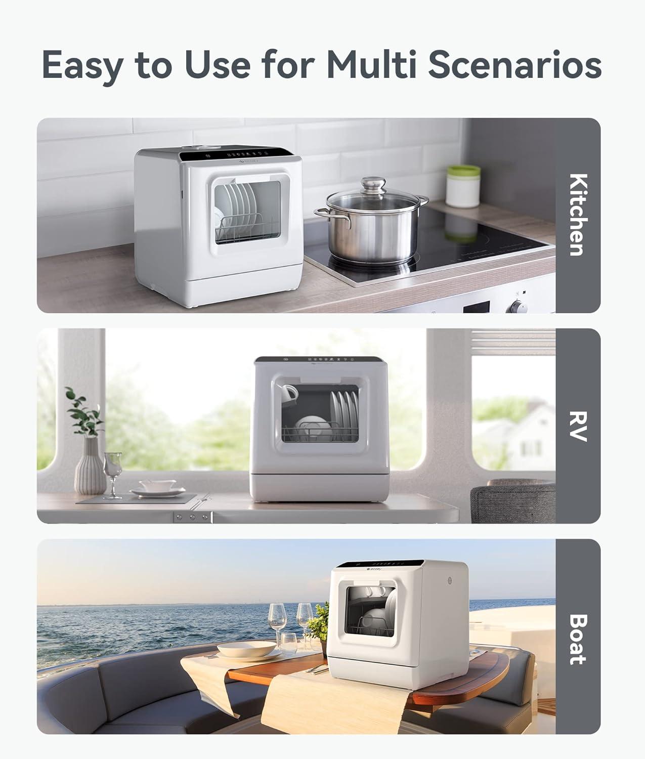 Compact and Convenient: Measuring 16.85 × 16.73 × 18.03 inches, the ecozy portable countertop dishwasher is perfect for families (ideal for 1-3 people), apartments, RVs, boats, camping, and more. It's large enough to accommodate a wide range of dishes of all sizes, but small enough to go wherever you need